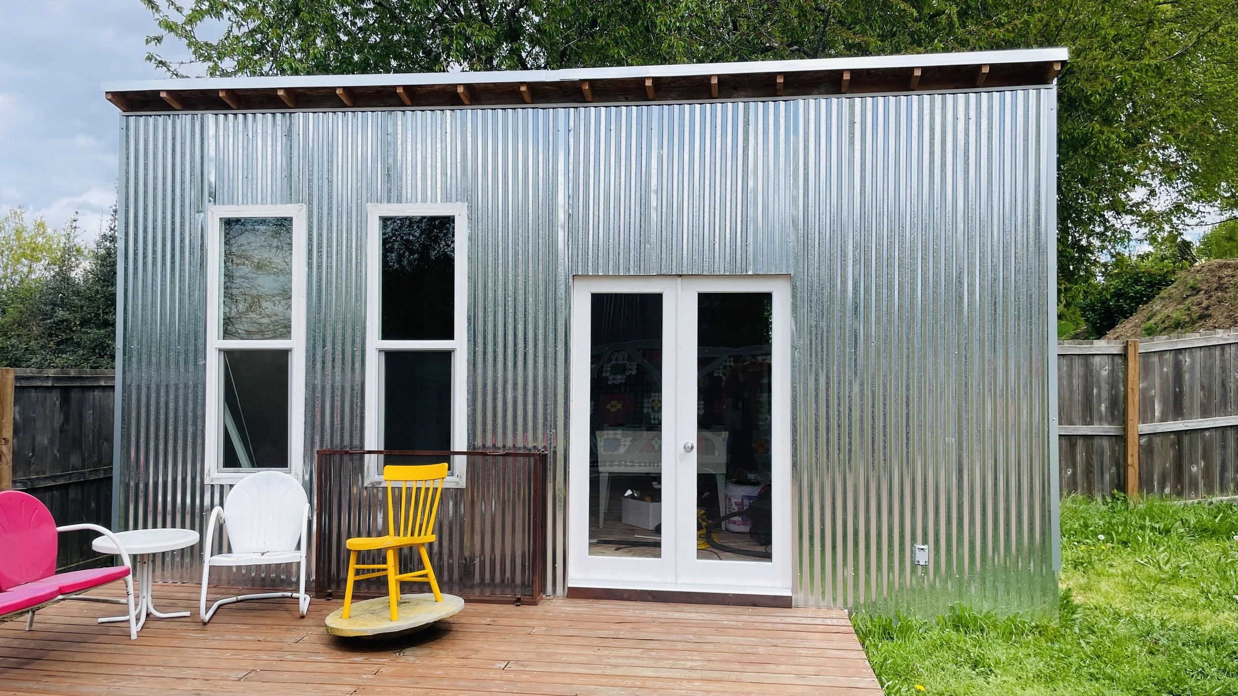 A 10' x 20' detached art studio, designed and built by Joyce Campbell with the hands-on help of her husband, Jeremy Hansen. Sparked by a need for space and a desire to build something joyful in which to make joyful things, the studio is a celebration of creativity and resourcefulness. Constructed from a playful mix of donated, reclaimed, sourced, and new materials, it’s a unique, hand-built haven—equal parts workshop and wonderland—crafted with care, collaboration, and a dash of delightful weirdness.